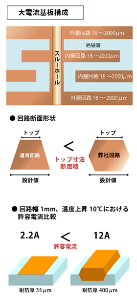 一般的なプリント基板の回路断面は右図左側のように【富士山型】になりますが、弊社の工法では右側のように【そろばん型】となります。これは厚銅配線の多層化製造技術として最適化した結果ですが、二次効果として断面積が大きくなることにより許容電流が増加します。