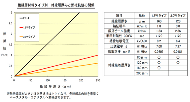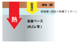 重要な要素として【熱伝導率】【耐電圧】【絶縁層厚み】があり、用途により最適な絶縁樹脂を選択する必要があります。