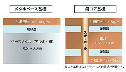 放熱性・耐熱性を強化したプリント基板で、メタル板の上に回路を形成したメタルベース基板、基板内部にメタル板を挟み込んだメタルコア基板の2タイプがあり、メタル材料はアルミ・銅などから選択できます。