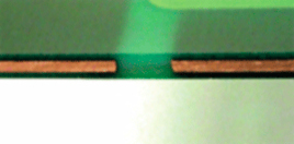 銅コア基板とした場合には銅コアとスルーホールの導通も可能になりますので、3層基板としてグランドや熱伝導用スルーホールといった利用も可能になりま す。スルーホールは熱輸送経路としても活用でき、高発熱部品の熱を銅の熱伝導率で瞬時にコアへ熱拡散することができます。さらに、銅コアへスリットを設け ることにより、2系統の電源,グランドとして利用可能です。(写真:スリットによる熱拡散性能の低下を考慮し、部品配置など注意する必要があります。)