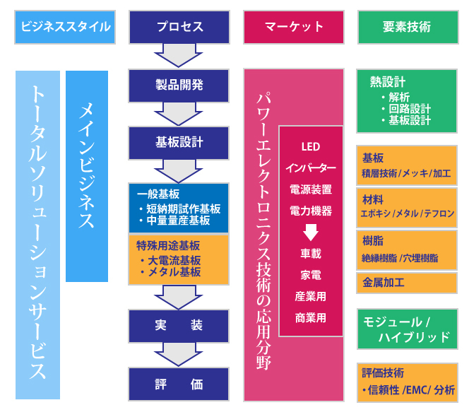 ●特殊用途基板(大電流基板、メタル基板等)技術を強化し、関連要素技術の擦り合わせを行い、オンリーワン技術を確立する。